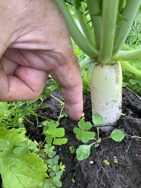 野菜作りのためには土地を開墾しなければならないこと、加えて肥沃な土地に変えるためには鍬やスコップを使って土を耕し、牛ふん堆肥等の自然の植物性副資材としてさらに落葉の腐葉土や腐植土・野菜くず等を加えてミミズなどの虫や微生物が長時間かけてある程度分解することで全て元の形が無くなり、ゴツゴツとする塊は地中に馴染ませ、サクサクふわっと軟らかにします。