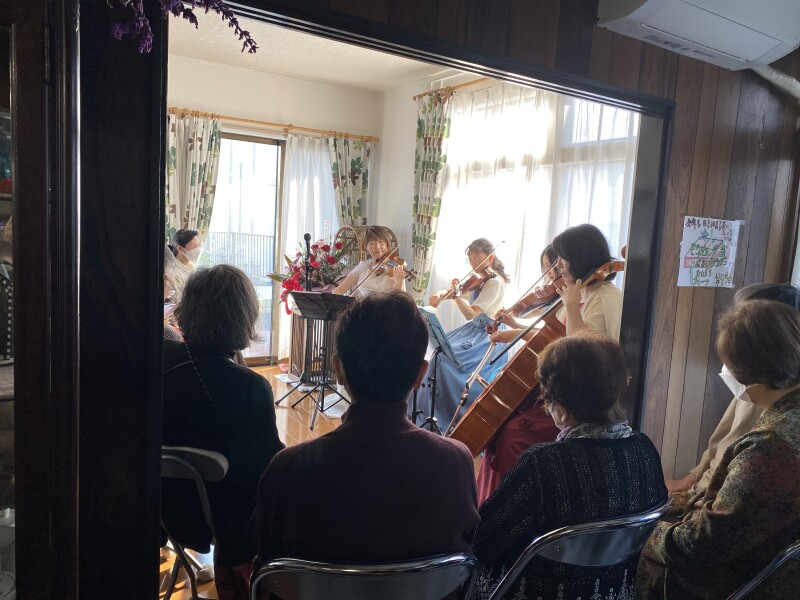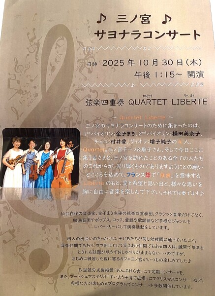 また、特記事項としては、4人の演奏者は仙台市内に在住し、各々主婦業で、東京の音楽大学の時のメンバーとも伺いました。活動の範囲は、仙台市内の老人ホーム等の施設に出向いて演奏会を定期的に行っているとのことでした。