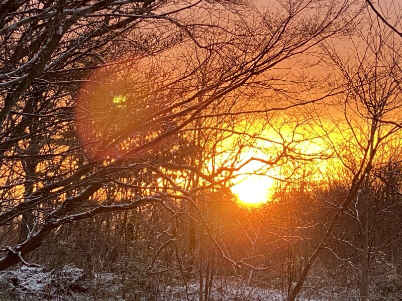 (写真右)遠刈田温泉 北山地区雑木林から昇る初東雲(はつしののめ)。地平と雲との間からの初日(暁) を望む(撮影者 山家雪雄)